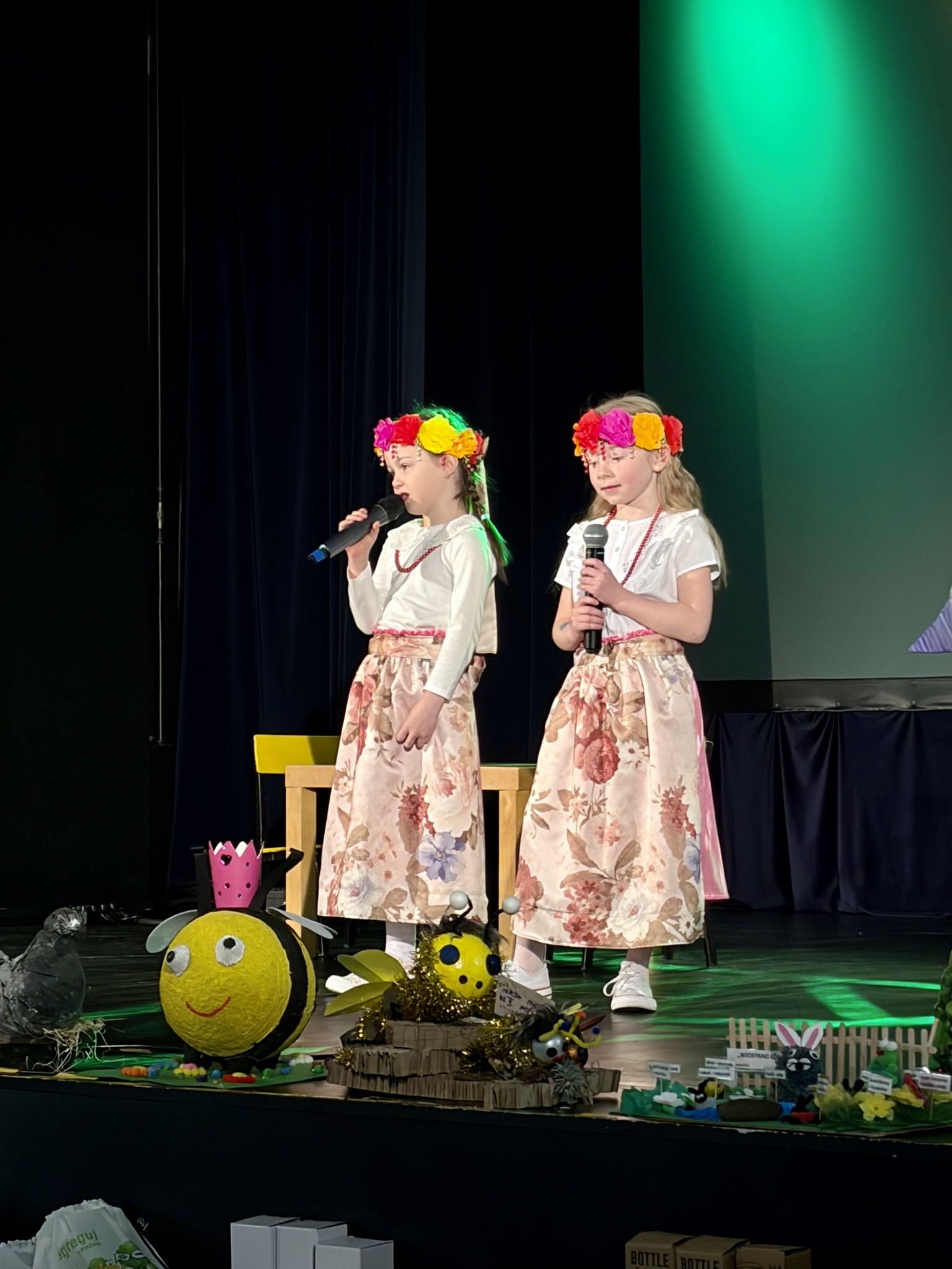 Na scenie mogliśmy podziwiać występy dzieci – piosenki, formy teatralne oraz ciekawe utwory po śląsku, które rozbawiły publiczność. Równolegle zaprezentowano wystawę nagrodzonych prac plastycznych inspirowanych przyrodą 🌱🎨